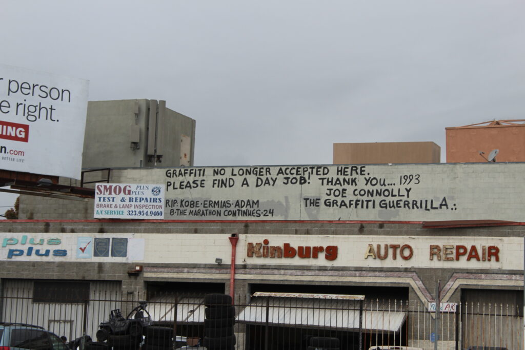 His piece reads the words, “GRAFFITI NO LONGER ACCEPTED HERE. PLEASE FIND A DAY JOB! THANK YOU… 1993, JOE CONNOLLY, THE GRAFFITI GUERRILLA. RIP KOBE, ERMIAS, ADAM. 8 – THE MARATHON CONTINUES – 24,” Ermias being Nipsey Hustle, and Adam being Connolly’s son, who he lost in a tragic accident. The piece has been on the corner of Pico Boulevard and Fairfax Avenue since 1993.