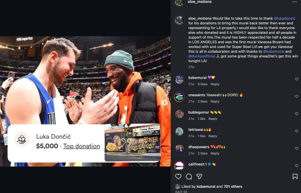 When his Byrant tribute was defaced, he returned to restore it with Doncic’s $5,000 donartion not as a business transaction, but to protect the collective memory Lakers fans have of Kobe Bryant.